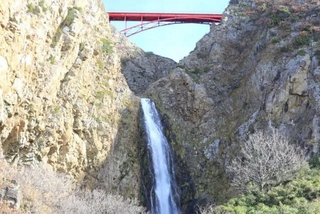 Ozare Falls is a magnificent waterfall that cascades down the Sotokaifu coastline, making a dramatic 70-meter descent to the sea below. Watch in awe as the powerful stream thunders down 100-meter-high cliffs, carved over millennia by coastal erosion. The best way to appreciate the full grandeur of the falls is by boat, viewing it from the sea. From this vantage point, you'll witness an unforgettable scene: the mighty waterfall crashing into the ocean spray, framed by the striking red arch of the Kaifu Ohashi bridge above. Don't miss the chance to also take in the stunning coastal views from the bridge itself.