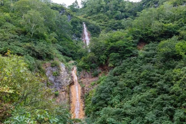 An hour's hike along the Mount Myoko trail from Tsubame Onsen in Myoko City brings you to a remarkable sight in North Jigokudani (Hell Valley), the source of Akakura's famous hot springs: two magnificent waterfalls! The upper Shomyo Falls has a 60-meter drop, and the lower Komyo Falls plunges 40 meters. Together, they create an impressive 100-meter curtain of water that dramatically cascades down the mountainside.
