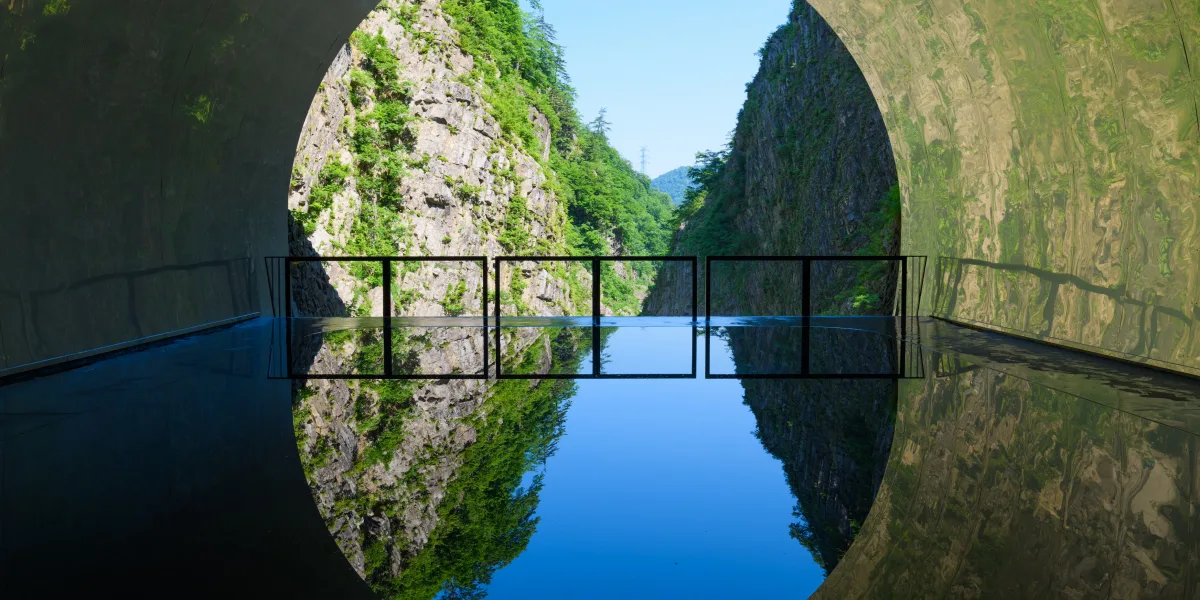 A pedestrian tunnel drilled through a mountain is the most popular of the Echigo-Tsumari interactive artworks. Oval spaces within the tunnel open to views of steep valleys, rocky slopes, and a snowmelt river sliding under clear skies. These spaces are perhaps the most Instagrammable locations in Niigata. For example, at the far end of the Panorama Station, the water pools to form a natural mirror, and the V-shaped cliffs plunging from the sky into the river are reflected on the water’s surface. Visitors come from afar to take photographs of themselves within this marvelous reflection. This tunnel, called the Tunnel of Light, is a scenic 40-minute drive from the House of Light.
