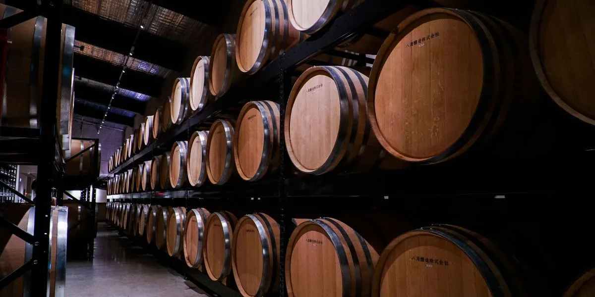 Oak barrels are lined up neatly beyond the snow room. These store rice shochu made by utilizing the techniques of sake brewing. The ginjo sake aroma derived from the sake lees will enchant you.