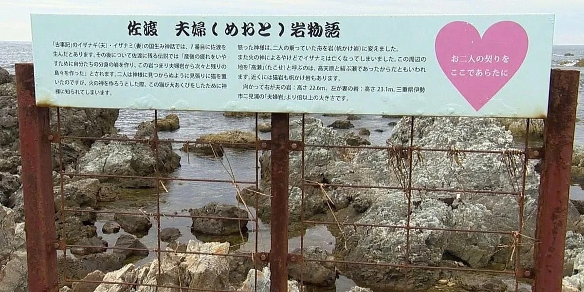The rocks symbolize the union between the two founding gods. The story goes that Izanagi and Izanami created Meotoiwa as their refuge on earth. It is said the gods hid here from the other heavenly god and rested after giving birth to their children; later islands were born from Meotoiwa. The rocks are said to bring good luck in finding romance. Sado islanders believe that if you tie a bamboo string on the sign outside of the roadside restaurant while thinking of new romance, when the string naturally falls off your wish will come true!