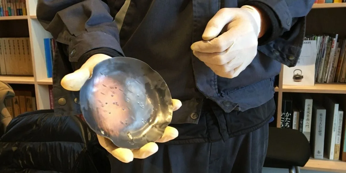 That’s because this process physically and chemically changes the metal so it regains its softness. Then, the artisan can continue to work with the piece until it’s once again too hard, compressing the copper more and more each time. At Gyokusendo, pieces often go through this cycle 15 times before reaching their finished state. The examples of each stage that are displayed in the workshop show just how much work goes into each piece.